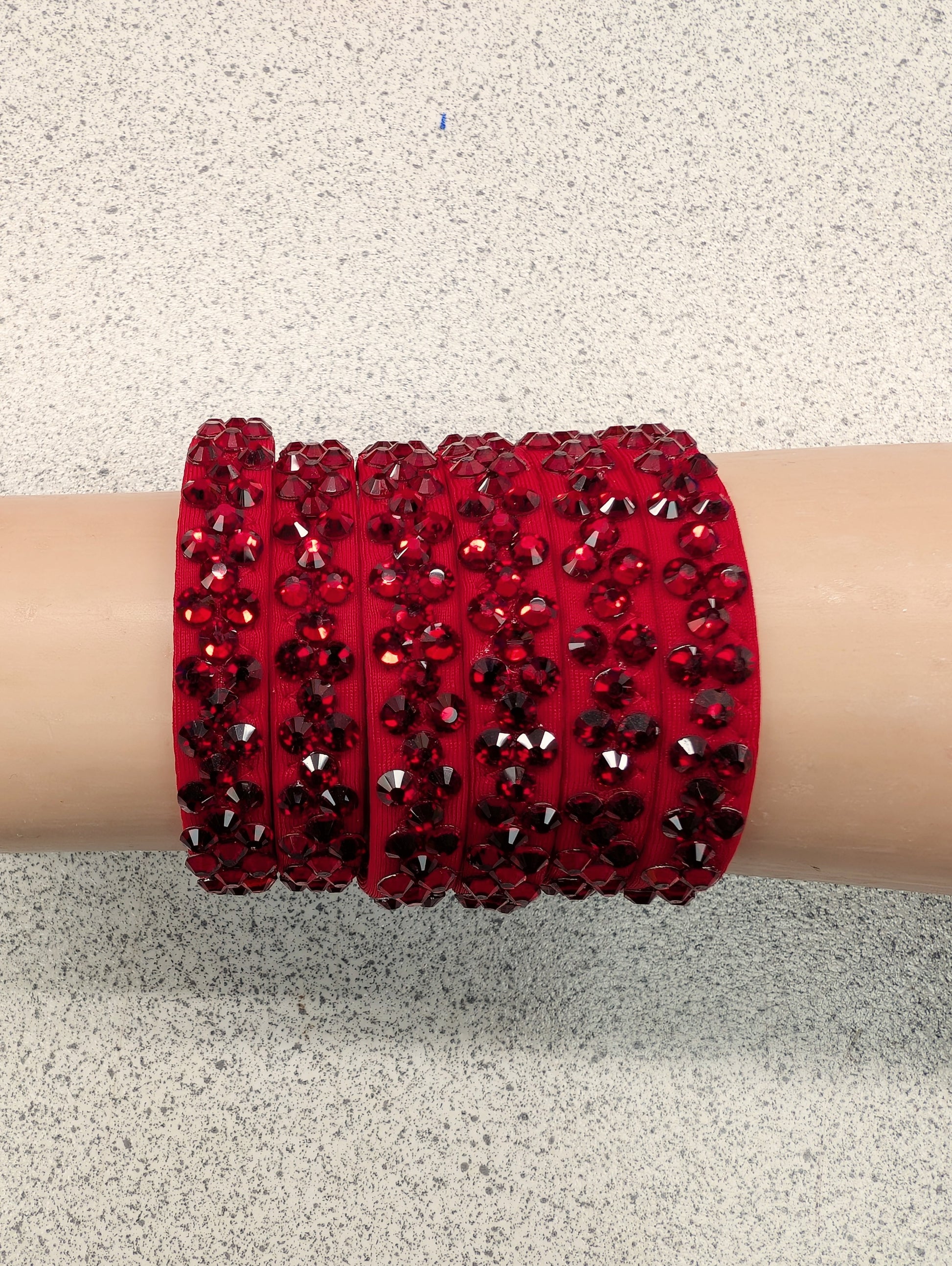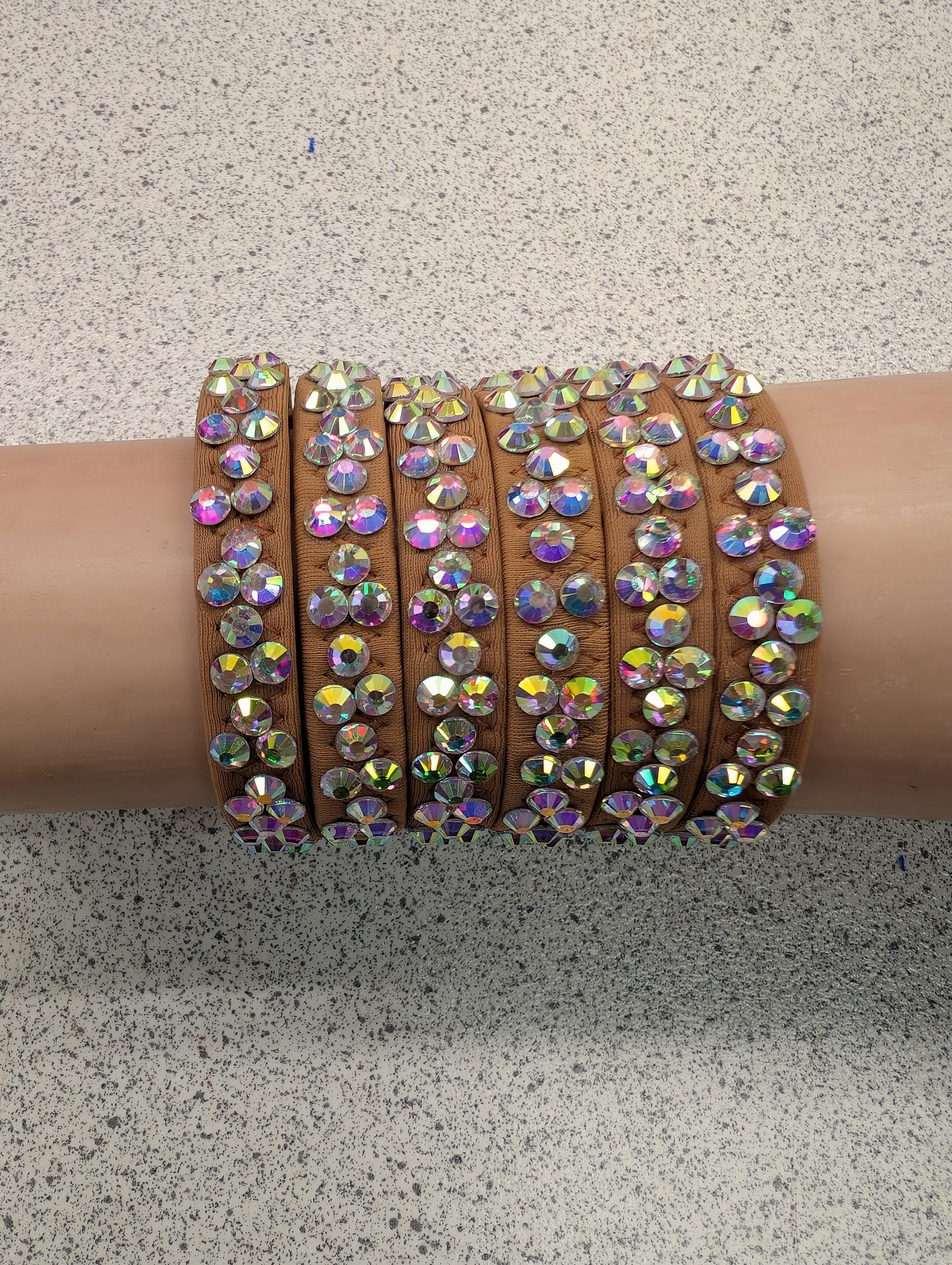 Beautiful dance bracelets made from elastic covered by lycra and crystals . Fantastic quality. Few colours available: